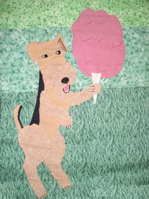 Henry & Augie are great pals and love to play and cuddle. I spend my free time painting pottery (Airedale themed of course!), scrap booking, watching my son play hockey and spending time with Henry & Augie. I also volunteer for Airedale Rescue of WNY doing home visits, transports and manning information tables at events. I just made a career change and began working as a Cosmetology Educator for The Salon Professional Academy. This is a big change for me and I’m looking forward to a new phase in my life. This will be the fourth quilt that I have worked on with the Bee. I enjoy doing the hand appliqué and consider it artwork. It’s amazing how each of these beautiful quilts can be completely planned via the internet. My block, “Cotton Candy” was a lot of fun to do. I wanted the personality of the Airedale to come through in the facial expression. He has that typical opened mouth smile that all Airedale lovers know and love.