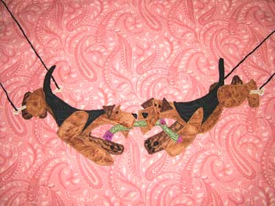 interpret my idea and put it on paper - and I thank her for doing such an incredible job. My very talented sister, Fran Mester, who lives in Edmonton, does the actual sewing and appliqué for me. So this is really a team effort. Fran is a very creative person, a wonderful seamstress and very supportive of all of my Airedale endeavors.