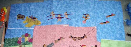 I then appliqued the tent onto the quilt top and added in details like the tight rope that couldn't be added until the tent was in place. I then added the dogs that crossed the boundaries of two blocks, such as the two with their backs to you that are watching the acrobats and the two that are sneaking under the right edge of the tent. This whole process was fairly complicated. I felt that since I designed the original drawing, I would also have to assemble the quilt top because it would be easier than trying to explain to someone else how all of the pieces fit together. In the end, we ended up with a lovely quilt top. |