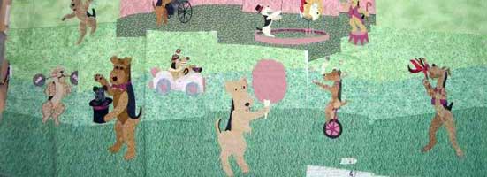 Cait, Christie and Argus. Once my circus sketch was approved by the Bee members, I set to work making a full-size drawing of the quilt. I drew in the big-top tent and then figured out roughly where all of the Airedales would be. I then had to make fine adjustments, moving the placement of the dogs around slightly so that each block-maker would have a rectangular space in which to design the details of their picture. This took a lot of planning because in order to assemble the blocks together into a finished quilt top, the blocks would need to line up in rows and columns. Yet, I didn't want the Airedales to look like they were standing on a grid, so I shifted them around. This meant that in some blocks, the Airedale might be snugged up against the left bottom corner of a large open rectangular space, so that it would not be placed directly below the dog in the next higher block in the quilt. I then traced a rectangle that was the size of each finished block. I sketched in the location of where the dog was to be placed and its size in each rectangle, and mailed each to the artists who drew in the details of each Airedale. The artists returned their drawings to me and I taped them all together to make sure that they would work together in the quilt and again made minor adjustments in placement and size of the dogs. Then I traced each rectangle and dog onto stabilizer that served as both the pattern for the block and as the back layer as the block was constructed. I mailed that pattern plus background fabrics to the block-makers. When they returned their finished blocks to me, I aligned the register marks on the patterns and was able to sew the blocks together into one big piece.